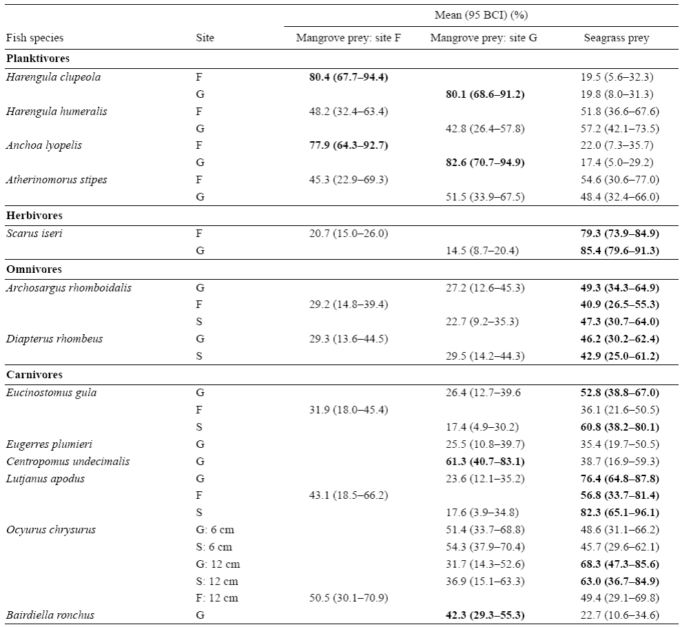 El modelo de mezcla SIAR mostró que las contribuciones medias (intervalo de confianza bayesiano [ICB] al 95%) de las fuentes de alimento provenientes de los manglares fueron mayores en las dietas de los planctívoros A. lyolepis y H. clupeola (78-83%) que en las dietas de las otras dos especies de planctívoros, Harengula humeralis y Atherinomorus stipes, las cuales dependieron igualmente de las fuentes provenientes de los manglares y pastos marinos (Tabla 4). Las contribuciones medias (ICB al 95%) de las fuentes de alimento provenientes de los manglares a las dietas de los carnívoros C. undecimalis y B. ronchus (pez residente de los manglares) fueron 61.3% (40.7-83.1%) y 42.3% (29.3-55.3%), respectivamente (Tabla 4). En contraste, el herbívoro Scarus iseri, los omnívoros Archosargus rhomboidalis y Diapterus rhombeus, y los carnívoros Eucinostomus gula, L. apodus y los juveniles de talla grande de O. chrysurus dependieron más del alimento proveniente de los pastos marinos que de los manglares, independientemente del sitio de muestreo (Tabla 4). No obstante, los bajos porcentajes de contribución obtenidos para los omnívoros y el carnívoro residente B. ronchus indicaron que faltaban algunas presas adicionales en el modelo. En la dieta de O. chrysurus se observó un ligero incremento en la proporción de componentes provenientes de los pastos marinos entre los especímenes pequeños (ICB al 95% de presas oscilando entre 29.6% y 62.1%) y los de mayor tamaño (ICB al 95% de presas oscilando entre 29.1% y 85.6%) (Tabla 4).