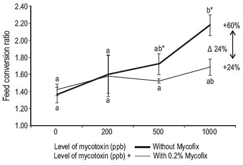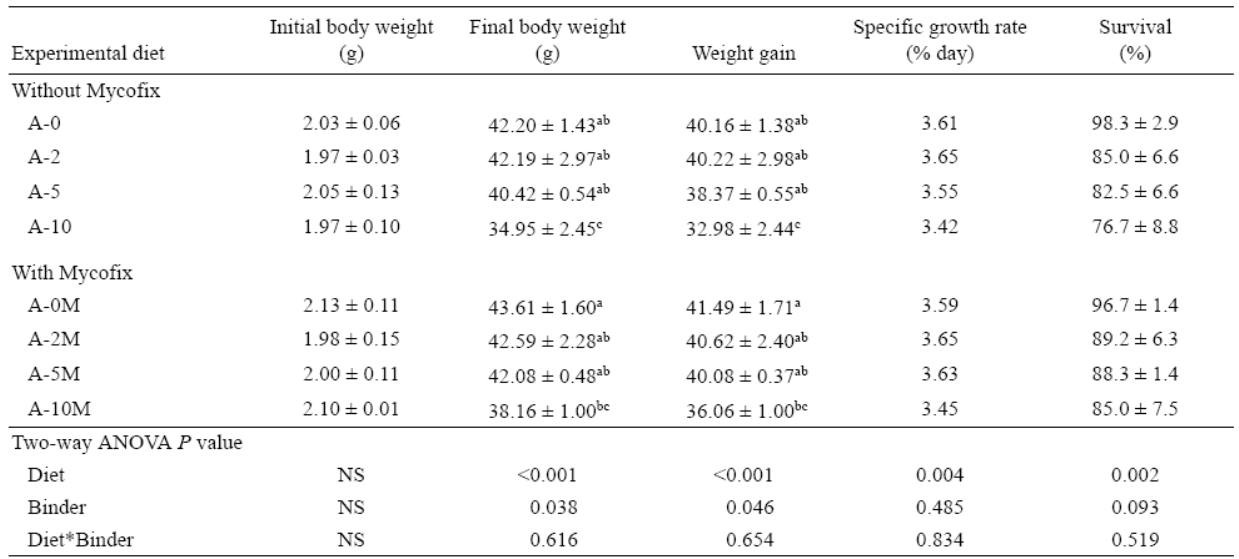 En el presente estudio, los tratamientos que contenían Mycofix Secure mostraron una disminución de los efectos negativos sobre el crecimiento y la supervivencia (aumento de peso, TCE y TCA) en comparación con los tratamientos sin el aglutinante. Las dietas con el aglutinante mostraron una menor reducción en aumento de peso en comparación con las dietas sin éste. Es interesante notar una acentuada disminución en ganancia de peso entre 500 y 1,000 μg/kg de AFB1, lo que sugiere que éste es el nivel en que la especie empieza a tener dificultades para lidiar con el daño biológico de las toxinas. La presencia de AFB1 en la dieta afecta negativamente la TCA de P. fulvidraco. En el tratamiento A-10M el aglutinante mejoró la TCA en un 24% en comparación con el tratamiento respectivo sin Mycofix (A-10). En general, Mycofix mejoró la TCA en comparación con el grupo control. Aunque las diferencias no son estadísticamente significativas, desde una perspectiva económica, la mejoría en la TCA (e.g., 24% para el nivel de 1,000 μg/kg de AFB1) representa un ingreso real para los acuicultores.