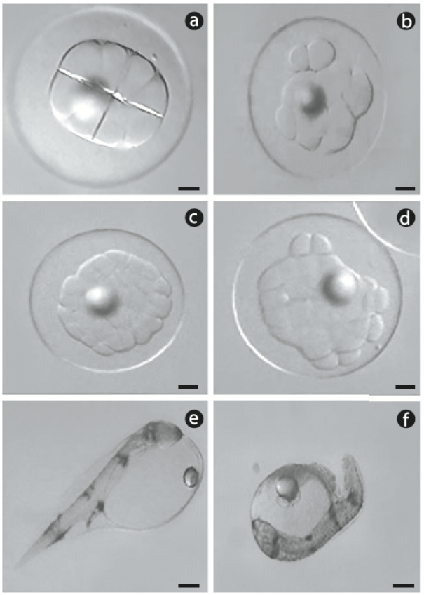 Se usaron desoves de 13 hembras: 7 en 2008 y 6 en 2009. Cada desove fue fertilizado con semen de 3 a 4 machos. Se dividieron los huevos fertilizados de cada hembra en 2 grupos: grupo control (2 réplicas) y grupo sometido a choque frío (3 réplicas). Después del tratamiento de choque frío, aproximadamente 50 huevos de este grupo y 50 huevos del grupo control fueron depositados en microplacas de 12 pozos (4 huevos por pozo) con agua de mar estéril. Se determinó la división celular normal o anormal bajo un microscopio óptico de disección. Como la cabrilla arenera es una especie de desarrollo rápido, se observaron algunos desoves tan pronto como la fase de 4 células, mientras que otros no se observaron hasta la fase de 32 células, pero nunca después. Todos los embriones que no mostraron una división normal (ver Fig. 1 a) fueron considerados anormales (Fig. 1b). Los embriones en la fase de 32 células fueron considerados normales o abnormales con base en la organización estructural de los blastómeros (Fig. 1c, d). Después de esta evaluación, se colocaron las microplacas de 12 pozos en una incubadora de temperatura controlada (25 ºC). Después de la eclosión, se registró el número de embriones muertos y de larvas vitelinas vivas y muertas. Las larvas vitelinas que estaban dobladas o ligeramente opacas se registraron como muertas (Fig. 1e, f).