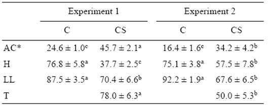 Tabla 1 Porcentajes de división celular anormal (AC), eclosión (H), larvas vivas (LL) y triploidía (T) (promedio ± error estándar) para los huevos de la cabrilla arenera (Paralabrax maculatofasciatus) del grupo control (C) y del grupo sometido a choque frío (CS) en los experimentos 1 (n = 7) y 2 (n = 6).