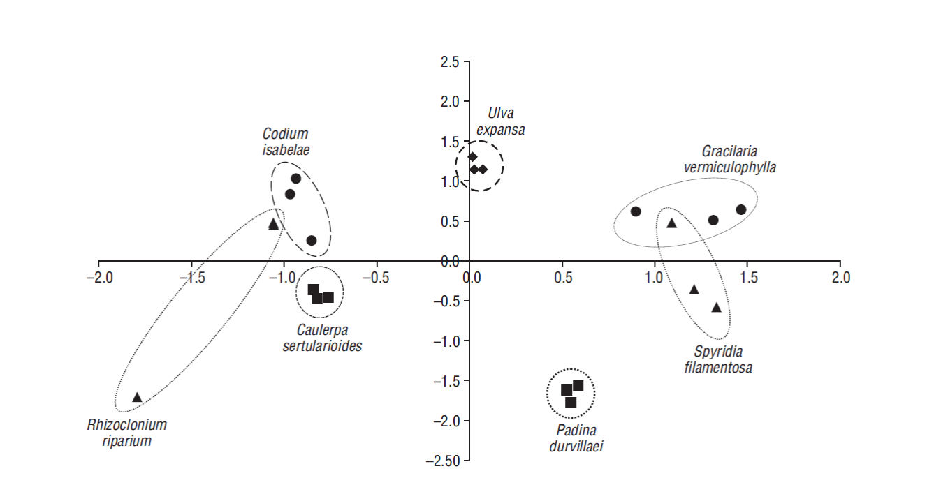 | Ulva expansa | Caulerpa sertularioides | Rhizoclonium riparium | Codium isabelae | Spyridia filamentosa | Gracilaria vermiculophylla | Padina durvillaei | |||