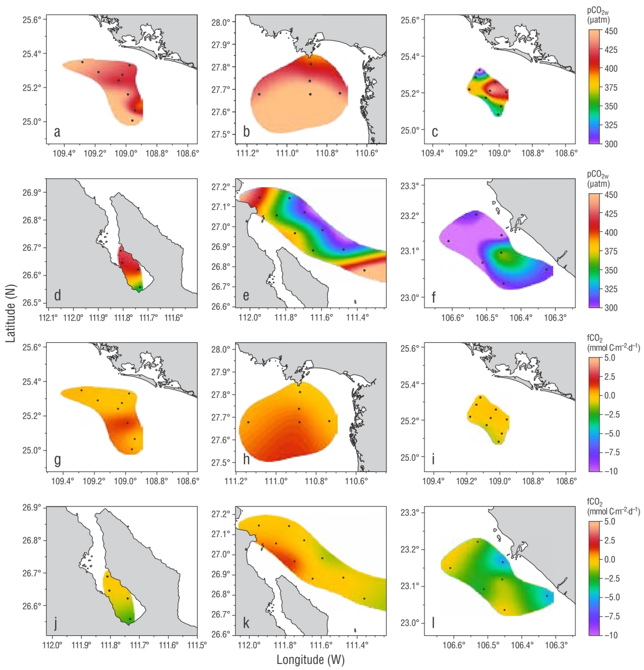 En BC2017, el intervalo de valores de fCO2 fue de -2.15 a -0.16 mmol C·m‒2·d‒1 (Fig. 4j). Los valores de Clsat (datos no mostrados) indicaron que gran parte del área fue de mesotrófica a eutrófica, con una posible actividad fotosintética alta en los días previos al muestreo, lo que podría ser la causa de valores negativos de fCO2. Sin embargo, existe variación espaciotemporal entre la absorción y el aporte de CO2 en el área de estudio que debe ser contemplada en investigaciones posteriores para describir la variabilidad del fCO2.
