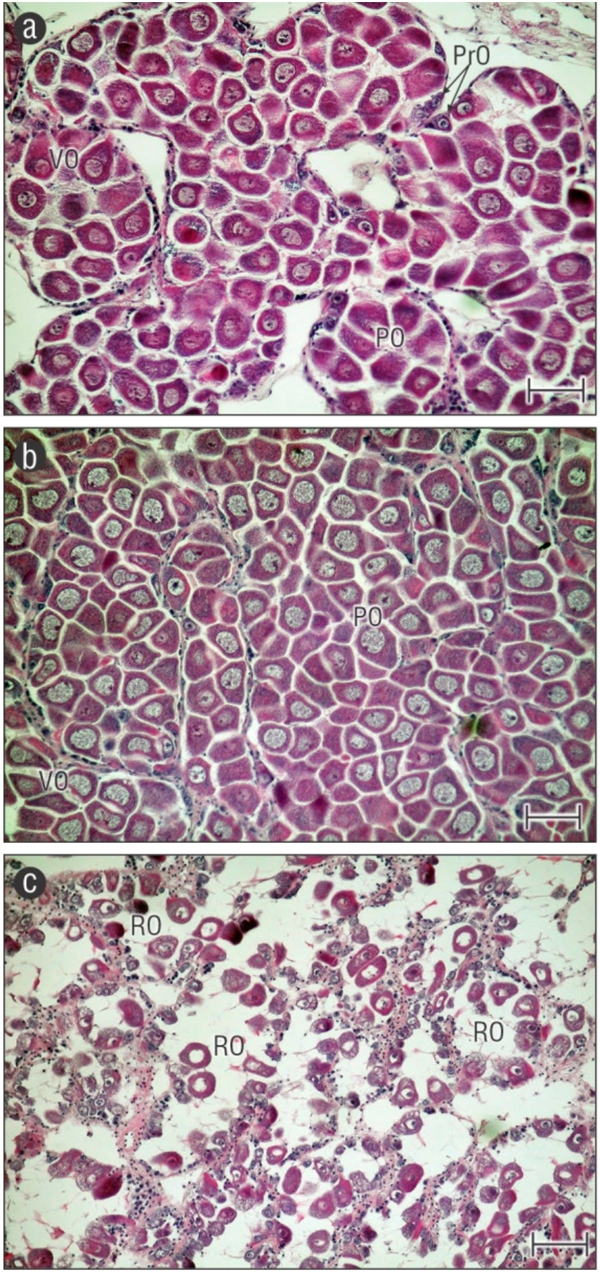Figura 1 Microfotografías de gónadas femeninas (10×) de la concha nácar Pteria sterna teñidas con hematoxilina-eosina, mostrando las etapas del ciclo gametogénico que predominaron en cada uno de los muestreos del estudio: (a) etapa de desarrollo en febrero de 2009, con ovocitos pre-vitelogénicos (PrO), ovocitos vitelogénicos (VO) y ovocitos post-vitelogénicos (PO) llenando los acinos; (b) etapa de madurez en noviembre de 2008 y junio de 2009, mostrando en su mayoría PO y pocos VO; y (c) etapa de desove en abril de 2009, donde solo se observan ovocitos residuales (RO) al interior de los ácinos. La barra de la escala es de 50 µm.
