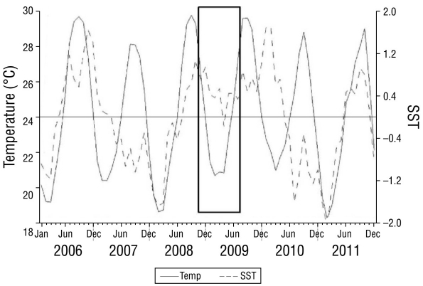 Figura 2 Variaciones en la temperatura del agua y anomalías en la temperatura superficial del mar (TSM) para el presente ciclo reproductivo 2008-2009 en la bahía de La Paz (rectángulo sólido), comparado con ciclos previos (2006-2007) y posteriores (2010-2011).