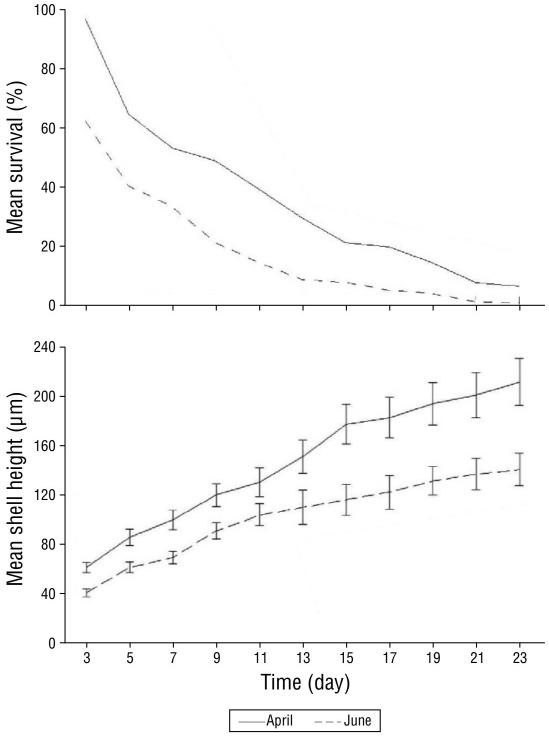Al día 11, la tasa promedio de crecimiento de las larvas umbonadas fue significativamente mayor (F = 18.1, P < 0.001) en abril 2009 que en junio 2009. Al día 23, las diferencias en la tasa de crecimiento de las larvas pediveliger también fueron significativas (F = 24.5, P < 0.001) entre los meses de abril y junio (Tabla 2, Fig. 3). Las relaciones entre la altura de la concha de las larvas y el área de los ovocitos y entre la altura de la concha y el índice lipídico no fueron significativas (r = 0.30 en ambos casos).