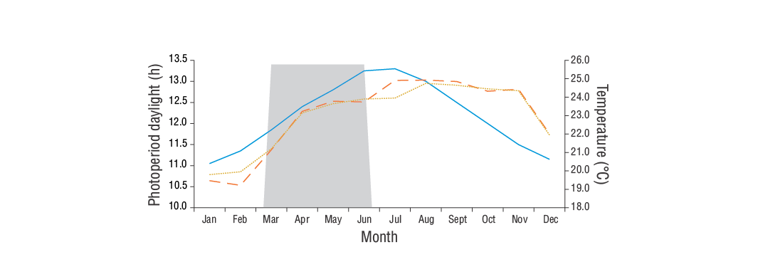 Se midió diariamente la temperatura (registrador de temperatura sumergible HOBO TidbiT, Onset; Bourne, MA, EE. UU.), la salinidad (refractómetro ATAGO; Bellevue, WA, EE. UU.) y el oxígeno disuelto (YSI 85, Yellow Springs Instruments; Yellow Springs, OH, EE. UU.). La temperatura media del agua durante el periodo de desove fue de 22.9 (1.2) °C, y osciló entre 21.1 y 23.8 °C. La temperatura del agua anual y el fotoperiodo se muestran en la Figura 1. La salinidad fue de 37 y el oxígeno disuelto osciló entre 5.3 y 6.2 mg·L-1.