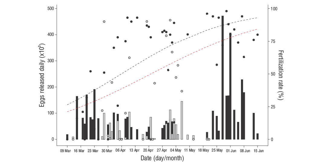 En 2006, luego de 22 meses desde el inicio del estudio, ocurrió una puesta de 90,000 huevos no fecundados, el único desove en ese año. Los primeros huevos fértiles se recolectaron hasta 2007. En ese año, el primer lote de huevos se recolectó el 9 de marzo y el último se recolectó el 29 de junio. En 2008, la fecha del primer desove fue el 12 marzo, y la temporada de desove finalizó el 21 de mayo. Las épocas de puesta ocurrieron en los periodos en los cuales la temperatura aumentó (de 21.1 a 23.8 °C en 2007 y de 21.2 a 23.6 °C en 2008) con el incremento de las horas de luz (Fig. 1). Durante este experimento, los primeros huevos fertilizados se recolectaron justo antes de la oscuridad total, entre el atardecer y el anochecer, cuando era imposible observar algún signo de cortejo. El diámetro de los huevos presentó una media (±DE) de 864.0 ± 22.0 µm y un rango de 848.0 a 884.0 µm.