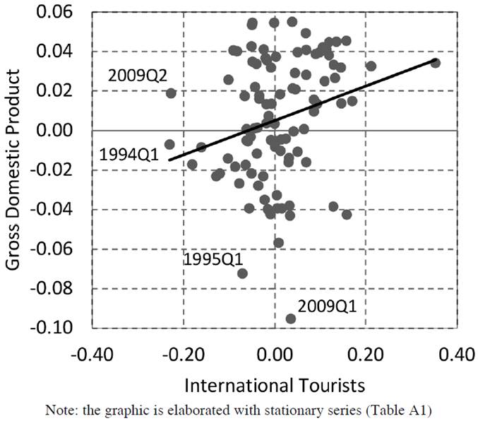During the 1995Q1 and 2009Q1 quarters, the Mexican economy suffered sharp declines, both as a result of economic crises. During the second quarter of 2009, there was a sharp drop in inbound tourism that evidences that the sector is susceptible to periods of crisis, as noted by Álvarez (1996).