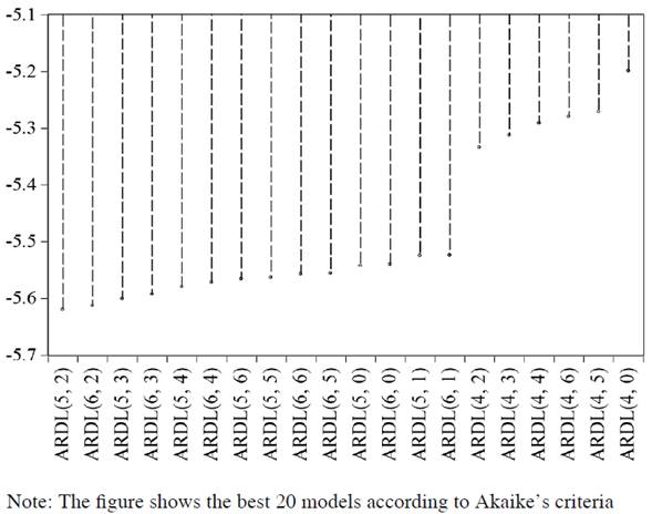 The Akaike criterion was used to determine the number of retards in the model, allowing a maximum of six laggs in each variable. The criterion indicates that the best estimate is an ARDL(5,2) (Figure A1). Table 2 summarizes the results.