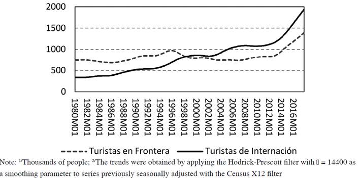 Figure 1 Mexico: trends in border and international tourism in the interior of the country, 1980M1-2017M09