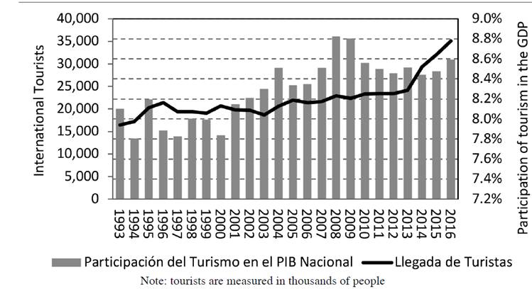 Figure 2 México: tourist arrivals and tourism participation in real GDP, 1993 - 2016