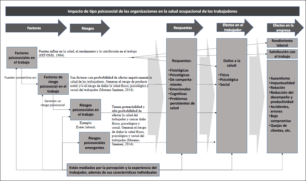 Factores de riesgo psicosocial. Estos factores tienen la probabilidad de afectar negativamente la salud física, psicológica y social en el trabajador. Generan el riesgo de producir estrés (Moreno-Jiménez, 2014). Además, generan el riesgo de dañar la salud del trabajador.