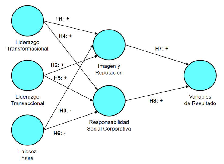 Hi: “Los factores de liderazgo transformacional, transaccional, laissez faire incidirán en la imagen y la reputación, así como en la responsabilidad social corporativa; posteriormente, estas últimas influirán en las variables de resultado”.