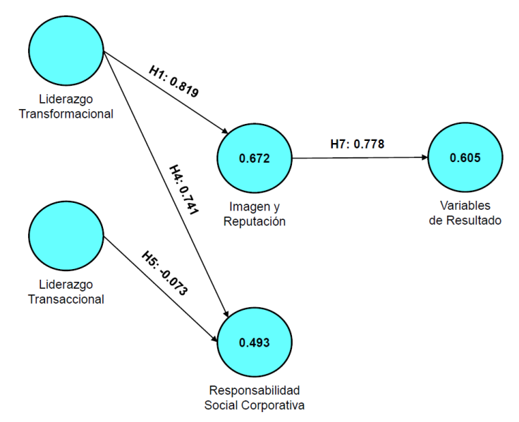 | Liderazgo transaccional | H2: | "El liderazgo transaccional influye de forma directa reputación” | No significativa | Imagen y reputación | 0.672 | Rechazar |