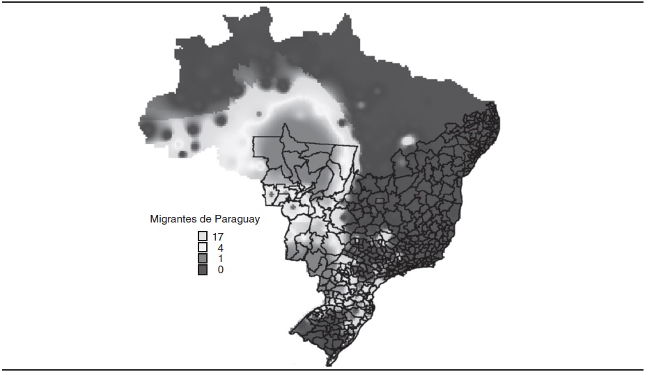 La tendencia en los flujos provenientes de Paraguay es muy clara, como se observa en el mapa 1. El total de microrregiones está localizado en dos grandes regiones: cerca de la frontera con Paraguay, en los estados de Paraná, Mato Grosso do Sul y Santa Catarina; o en el norte del estado de Mato Grosso, frontera sur de la región del Amazonas, una zona con una alta relación positiva de migración neta (Golgher, 2006). Existen pocos migrantes de retorno de Paraguay en las demás regiones.