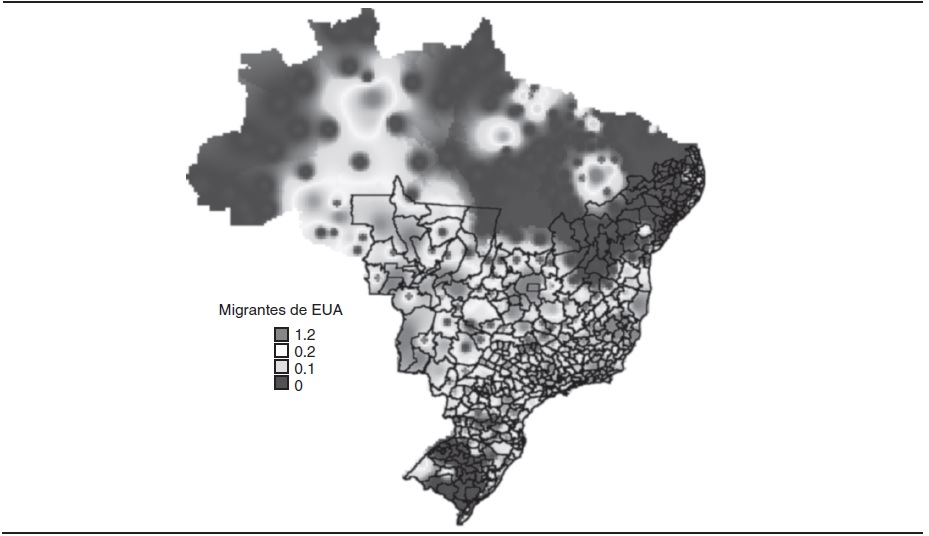 Dada la importancia de las redes sociales, es de esperar que las áreas de migración de retorno de preferencia y el origen actual de la migración internacional sean similares. Por lo tanto, muchos individuos que solían vivir en las primeras áreas ahora radican en el extranjero. Existen millones de brasileños que residen en el exterior (Golgher, 2004) y una proporción razonable regresa a Brasil dentro de un periodo de cinco años. A pesar de esto, los números observados para la migración internacional de retorno son bajos, y de seguro subestimados. Las encuestas elaboradas específicamente para explicar este tema podrían mejorar en buena medida la posibilidad del análisis, el que en la actualidad no se encuentra en el campo de investigación del Censo de Población de 2000.