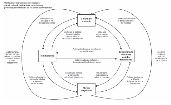 El artículo ofrece una perspectiva integral de las interrelaciones y mecanismos a través de los cuales se manifiestan las influencias entre marcos cognitivos, culturas, instituciones y redes relacionales. Al considerar el mercado como un campo incrustado en un contexto específico, se proporciona un marco analítico e historicista que permite observar a los actores dentro de una matriz social multidimensional. Esta matriz los posiciona en el espacio social, les otorga recursos para alcanzar sus objetivos y limita sus oportunidades en el mercado de diversas maneras, dependiendo de las restricciones fundamentales del mismo.