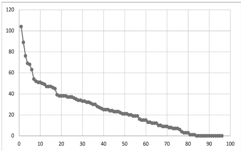 Más allá de la mera presencia o la creación de un perfil, se ha analizado el grado de utilización de las plataformas para difundir su producción científica y se ha podido observar que es muy desigual entre los investigadores incluidos en el estudio. De ellos, 83 (86,5 %) han introducido datos de sus publicaciones en alguna de las plataformas, mientras que 13 investigadores no lo han hecho y únicamente cuentan con un perfil en alguna plataforma, pero sin aportar datos de sus publicaciones. El número medio de publicaciones que los investigadores han referenciado en su perfil es de 25 y la mediana es 21,5, aunque como se puede apreciar en la Figura 2, existe una gran disparidad entre los documentos que cada investigador ha incluido en su perfil. Más de 30 % de los investigadores (eje de abscisas) ha referenciado menos de 10 documentos publicados (eje de ordenadas) entre 2010 y 2018 en estas plataformas y algo más de 10 % de los investigadores ha mencionado más de 50.