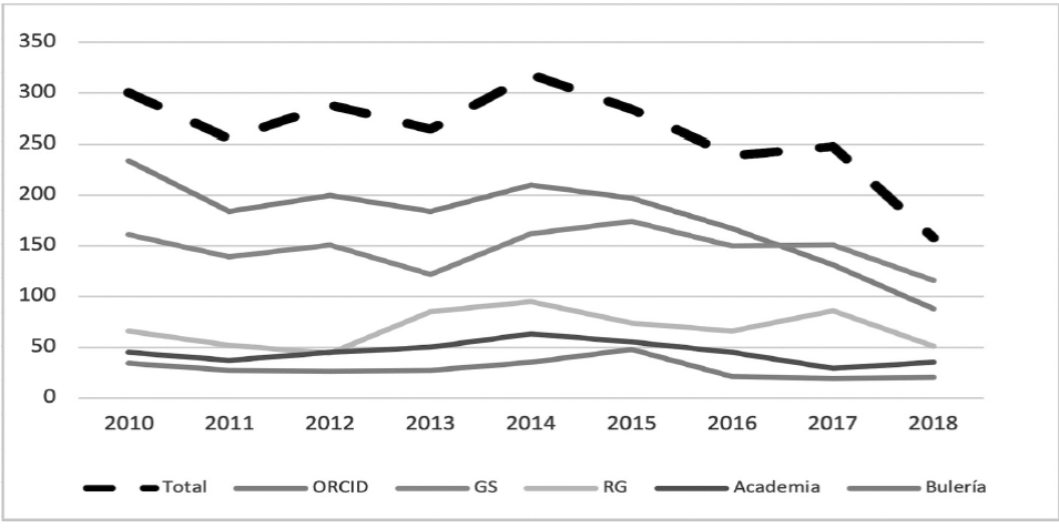 Número de documentos en cada perfil. Se contabilizó el número de publicaciones científicas que cada investigador tenía en cada plataforma publicadas entre 2010 y 2018. De esta forma, con más de un año de plazo, se dio tiempo suficiente a los investigadores para que incluyeran esos documentos en sus perfiles. Se eliminaron duplicados en el caso de que un investigador tuviera más de una versión del mismo documento.