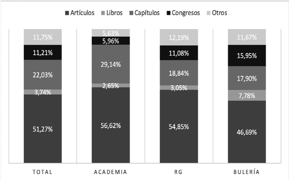 Con respecto a la tipología de los documentos depositados, se aprecia una alta y lógica correspondencia con la tipología de los documentos referenciados (Figura 7). Se ha observado un notable predominio de los artículos de revista sobre otros tipos documentales, así como una escasa presencia de libros en las tres plataformas, sobre todo en las RSA. En Academia.edu existe una mayor proporción de capítulos de libro que en RG y BULERIA, mientras que las aportaciones a congresos u otras tipologías documentales tienen un nivel de depósito considerablemente menor.
