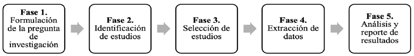 Este artículo se realizó a través de una Revisión Sistemática Exploratoria (RSE), también conocida como scoping review. El propósito de la RSE es determinar el alcance de la literatura relacionada con un tema específico, proporcionando una visión global de los estudios disponibles y sus respectivos enfoques (Munn et al., 2018). Para hacer esto, seguimos la metodología propuesta por Arksey y O'Malley (2005), la cual está estructurada en cinco fases (Figura 1):