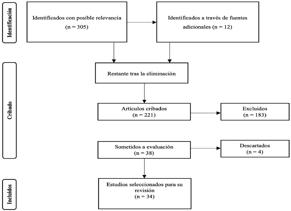 En la tercera fase, se identificaron 221 estudios después de eliminar los duplicados. De estos fueron descartaron 183 que no cumplían con los criterios específicos. Tras un análisis minucioso, obtuvimos 38 estudios, de los cuales 4 fueron excluidos por no proporcionar información relevante. Por consiguiente, 34 estudios formaron parte del corpus final (Figura 2):