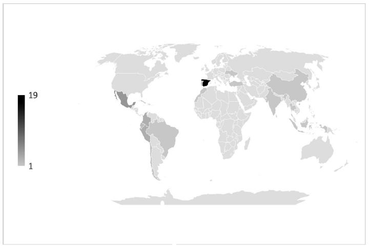A partir del análisis de las publicaciones seleccionadas, es evidente una proporción lingüística equitativa: 50% está en inglés y 50% en español. La distribución temporal de estos artículos puede observarse en la Figura 3. En términos de ubicación geográfica, España encabeza la lista con 39%, seguida de México con 11% en lo concerniente a menciones de países donde la AMID ha sido evaluada. Tal puede verse en el mapa de la Figura 4.