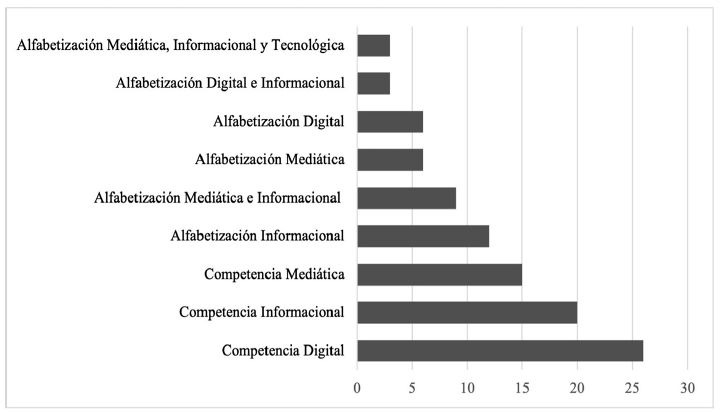 El constructo 'competencias' fue el más identificado en las publicaciones, superando al de 'alfabetización'. Si bien estos términos a menudo son usados indistintamente en el marco europeo (Ferrari, 2013), no siempre tienen las mismas implicaciones, ni el mismo grado de generalidad dependiendo del contexto lingüístico y la perspectiva desde la que sean aplicados (Meyers, Erickson y Small, 2013). Los constructos predominantes derivaron de tres referentes clave; estos son presentados en el Anexo 2. Dichos referentes brindan un sólido marco teórico y una base confiable para la investigación, lo que los convierte en valiosas fuentes de información para el análisis de la AMID.