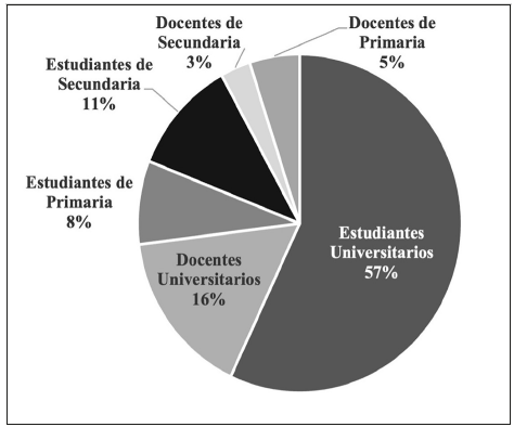 Las prioridades de los estudios se enfocaron en diversas poblaciones. La Figura 6 muestra que la población universitaria, la cual incluye a estudiantes y profesores, representa el 73%, mientras que los grupos de educación primaria y secundaria el 27%: