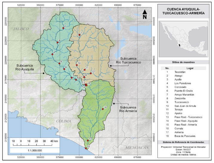 El río Ayuquila-Armería está situado en Jalisco y Colima, en la región occidental del país, entre las coordenadas geográficas 18° 51’ 05” a 20° 28’ 03” N y 104° 38’ 17” a 103° 34’ 41” O. Tiene una superficie de 10 257 kilómetros cuadrados, y tiene su origen en la confluencia de los ríos Ayuquila y Tuxcacuesco. Luego de la confluencia se le llama río Armería hasta su ingreso al estado de Colima. Su recorrido abarca una distancia de 321 kilómetros, partiendo de su punto más alto a una altitud de 3290 metros y terminando en su desembocadura en Boca de Pascuales en Colima (Cotler et al., 2010). La cuenca presenta un clima cálido subhúmedo, templado subhúmedo y semicálido subhúmedo, todos caracterizados por precipitaciones estivales. La temperatura media anual está entre 14-28 ºC, y la precipitación total anual oscila entre 700-2000 mm, representando la evaporación el 80-90% de la precipitación total (Meza-Rodríguez et al., 2017) (Figura 1).