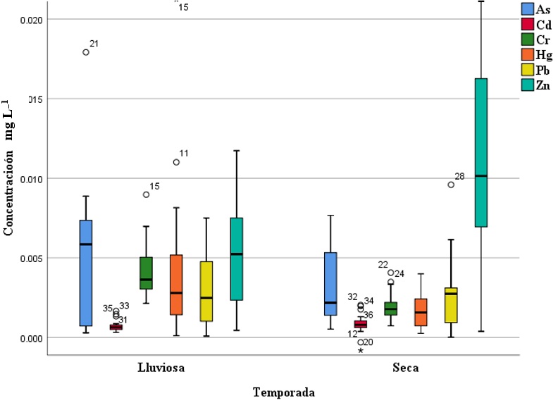 Para el metaloide As las concentraciones oscilaron entre 1.24 a 19.93 mg kg-1 con un promedio de 6.92 mg kg-1 en la temporada lluviosa, en contraparte en la temporada seca las concentraciones fluctuaron entre 1.37 a 19.83 mg kg-1 con un promedio de 13.71 mg kg-1, Se detectaron discrepancias estadísticamente significativas entre los períodos de muestreo (F= 7.66; P = 0.009). De las 47 muestras obtenidas, 25 muestras (53%) superan el LMP establecido por FAO (2012) de 4.7 mg kg-1; En cuanto a las concentraciones por temporada, 9 muestras de la temporada lluviosa superan el LMP, lo que representa el 41% del total de las muestras de esa temporada; y 16 muestras que representan el 64% del total de muestras en la temporada seca.