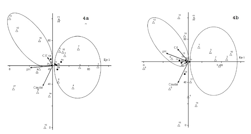 El análisis de correspondencia canónica (ACC) para la temporada lluviosa (Figura 4a), indica que la variación total de la asociación entre los factores ambientales (pH, C.E y caudal) y las concentraciones de metales pesados (As, Cd, Cr, Hg, Pb y Zn) encontradas en los macroinvertebrados puede ser explicada por el primer eje en un 55 % (P = 0.01), este eje agrupa ocho sitios y cuatro metales (As, Cr, Hg y Pb) y presenta una relación directa con el pH y el caudal. El segundo y tercer eje explican la varianza en un 10 y 13% (P = 0.01), en estos ejes se agruparon los nueve sitios y los dos metales restantes (Cd y Zn) en función de la relación con la conductividad eléctrica.