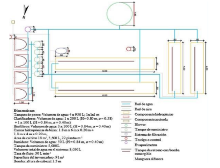 El sistema acuapónico de 8.05 m3 se instaló dentro de un invernadero de 91 m2, en el Colegio Postgraduados, Campus Montecillo, en las coordenadas geográficas de 19° 27’ 59.5” N, 98° 55’ 01.5” O y 2250 m de altitud. Se instalaron cuatro contenedores para la producción acuícola con un volumen neto de 950 litros cada uno. En el sistema de filtrado se utilizaron cinco contendores de plástico, para la clarificación del agua se utilizó un contenedor de 200 L y cuatro tambos de 100 litros de agua para tratamientos de segunda clarificación, mineralización, nitrificación y desgasificación. En el sistema hidropónico se instalaron cuatro balsas rectangulares de 3.6 m3, en una superficie de 18 m2 por 30 cm de altura recubierta con geomembrana de polietileno de alta densidad (0.75 mm). La Figura 1 presenta el diseño y las dimensiones del sistema acuapónico instalado. El movimiento de agua en el sistema fue por gravedad, donde el nivel mayor se encontraba en los tanques de peces y el menor en un tanque de 50 L tipo sumidero, se instaló una bomba sumergible para que el agua tratada (por los filtros y las plantas) se regresara hacia los peces y generar la recirculación.