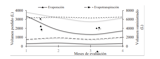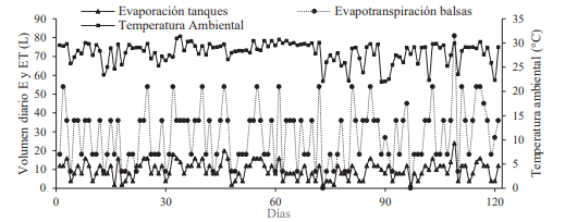 La temperatura osciló en el rango de 13.7 y 46.1 °C con una media de 28.1 °C. El volumen total evaporado durante todo el periodo de evaluación fue de 1190 L con un promedio de 9.75 L diarios y el volumen total evapotranspirado fue de 3465 L con un promedio de 28.4 L diarios (Figura 3).