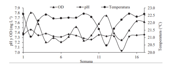 Se mantuvieron valores medios viables para los tres organismos de acuerdo con los rangos de Somerville, Cohen, Pantanella, Stankus y Lovatelli (2014) en las variables de oxígeno disuelto (OD) de 7.4 mg L-1 con un rango de 4.5 a 8.9 mg L-1, temperatura de 22.1 °C con un rango de 20.4 a 22.7 °C y pH de 7.3 con un rango de 6.9 a 7.7 (Figura 4).