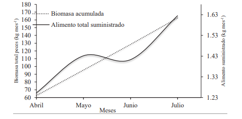 La cantidad de alimento suministrado en todo el experimento fue de 174.73 kg, que en un inicio la ración diaria fue del 2% de la biomasa total. Pero se observó que los peces no consumían todo, que podría ser ocasionado por la baja temperatura ya que, al disminuir su actividad física y apetito, así que el porcentaje disminuyó hasta llegar al 1%. La biomasa total ganada creció linealmente mientras que el alimento suministrado tuvo ligeras variaciones (Figura 5).