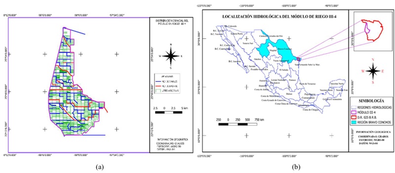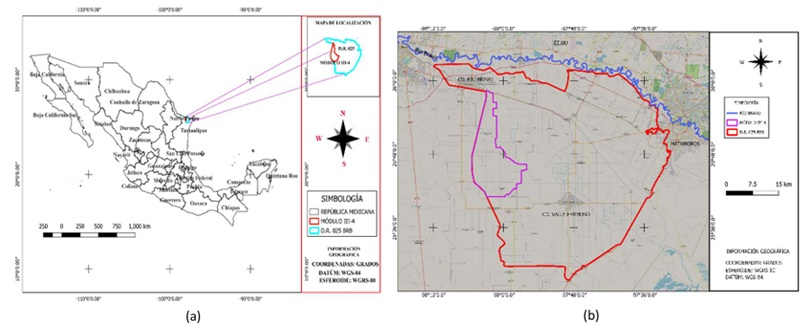 El Distrito de Riego 025 Bajo Río Bravo (DR-025) se encuentra en Tamaulipas, noreste de México, abarcando alrededor de 200 000 ha en los municipios de Matamoros, Valle Hermoso, Río Bravo y Reynosa y su infraestructura se organiza en cuatro unidades de riego, subdivididas en nueve módulos (SEGOB, 2016) (Figura 1a). El Módulo III-4 “Hidráulica Los Ángeles, A.C.” es el área de estudio, ubicado al oeste del DR-025, abarcando 22 833.44 ha y operando con 10 secciones de riego (Figura 1b). La red incluye 47 canales (156.67 km) y 193 drenes (315.79 km) (ANUR, 2020). El agua proviene de la presa internacional “La Amistad” y se distribuye a través de la presa Falcón y el canal Anzalduas, operado por la CONAGUA. El Módulo pertenece a la región hidrológica Bravo Conchos y utiliza tanto aguas superficiales como del acuífero Río Bravo (CONAGUA, 2024) (Figura 2 a y 2b).