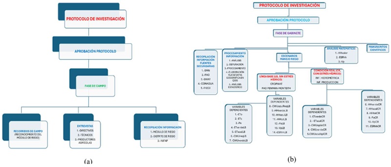 El estudio se llevó a cabo en dos etapas: campo y gabinete. La fase de campo incluyó recorridos, entrevistas y recopilación de datos. La fase de gabinete abarcó la recopilación de fuentes secundarias, procesamiento de datos, diseño de escenarios de riego (Línea Base y Condición Real), análisis de indicadores económicos y elaboración del manuscrito. Las Figuras 3a y 3b ilustran las fases y su interrelación.