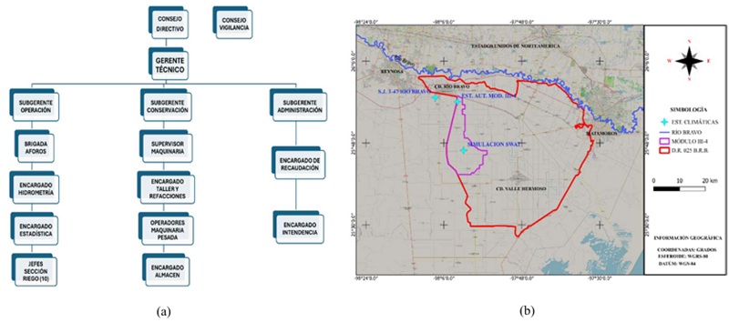 El módulo de riego está dirigido por el Consejo Directivo y el Consejo de Vigilancia, ambos elegidos por los productores. La gestión operativa recae en el Gerente Técnico, quien desarrolla y supervisa los programas de riego, conservación y recaudación. El subgerente de operación se encarga de ejecutar el plan de riego, coordinar las brigadas de aforo y llevar el control estadístico de la producción. El subgerente de conservación lidera el mantenimiento de la infraestructura hidroagrícola, mientras que el Subgerente de Administración gestiona la recaudación de cuotas y finanzas del módulo (elaboración propia con base en entrevistas técnicas), Figura 5a.