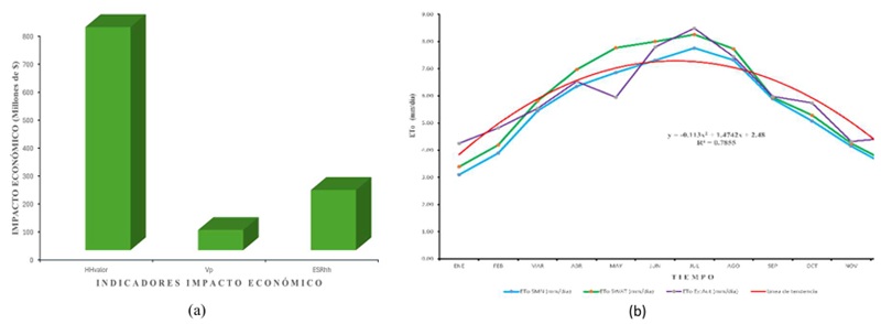 El objetivo para esta sección es realizar un análisis comparativo de los impactos económicos del estrés hídrico en los cultivos del Módulo III-4 utilizando los índices HHvalor, Vp y ESRhh, evaluados para la LB y la CR. Los resultados son los siguientes: En la LB, el HHvalor asciende a $ 1 578 368 023.84 (Cuadro 13), mientras que en la CR disminuye a $ 780 257 376.20 (Cuadro 14), generando un impacto económico de $ 798 110 647.64 (Figura 8a, Cuadro 15), equivalente a una reducción del 50.57%. El Vp muestra una reducción del 16.45%, pasando de $ 439 779 200.00 en la LB a $ 367 437 210.68 en la CR. La ESRhh cae del 100% en la LB al 61.66% en la CR, con un impacto económico de $ 215 410 806.25 (Figura 8a, Cuadro 15). La prueba ANOVA entre los tres indicadores muestra un valor F de 2.715, por debajo del crítico (3.098), indicando que no hay diferencias significativas entre los escenarios de LB y CR. Sin embargo, los indicadores revelan pérdidas económicas significativas, siendo mayores para HHvalor (50.57%) y ESRhh (48.98%), en comparación con Vp (16.45%).