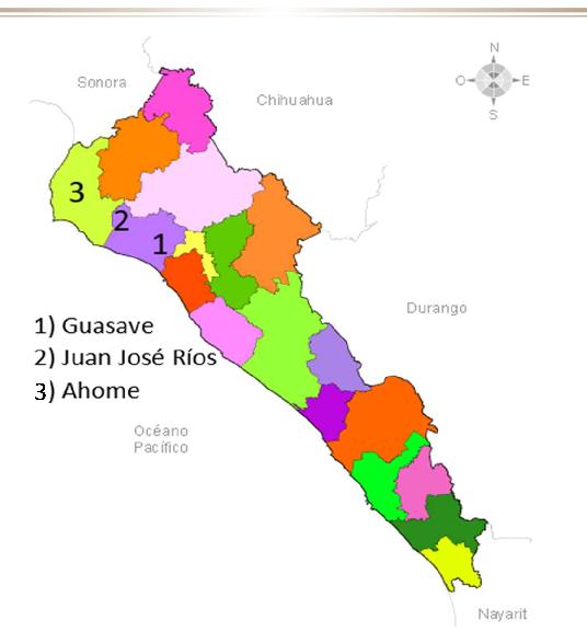 Como se mencionó antes, la investigación fue de corte transversal, es decir, se llevó a cabo durante un periodo especifico de tiempo (Cvetković-Vega, Soto, Lama y Correa, 2021), para este estudio, el ciclo agrícola del año 2024 (primavera-verano) y comprendió tres municipios correspondientes a la zona centro norte del Estado de Sinaloa, 1) Guasave (25° 33’ 56” N, 108° 28’ 19” O), 2) Juan José Ríos (25° 45’ 26” N, 108° 49’ 18” O) y 3) Ahome (25° 47’ 20” N, 108° 59’ 49” O), mismos que según CODESIN (2023) son los que presentan anualmente una mayor producción agrícola estatal, de un total de 20 municipios hoy en día y que se muestran en la Figura 1.