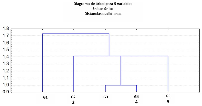 Se llevó a cabo un análisis de clúster, mismo que representa una técnica matemática derivada de la estadística multivariada, comúnmente representada mediante un dendograma. Este dendograma permite observar el número de grupos resultantes del análisis según los datos examinados (Núñez-Colín y Escobedo, 2011). Para la clasificación de grupos, es esencial seleccionar medidas de similitud o de distancia (disimilitud) adecuadas que ofrezcan información sobre el grado de parecido entre dos observaciones (Romero-Béjar y Cañadas, 2024).