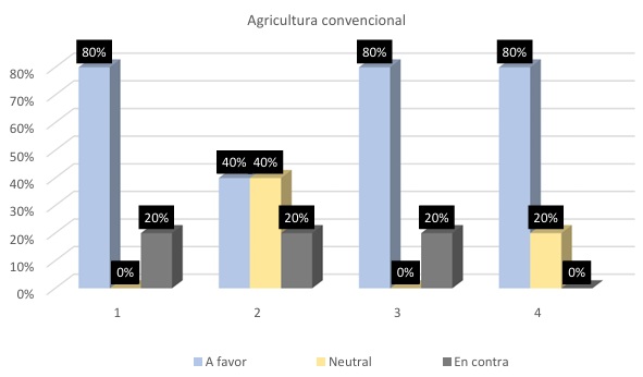 Sin embargo, un estudio de Sandoval-Gennovez, Moctezuma, Herrera y Espinoza (2022) sobre juventudes rurales en nuestro país, señala que los jóvenes pertenecientes a estas comunidades ven la agricultura como una opción de sustento, y son actores importantes para transitar de la agricultura orgánica, sin embargo, en la actualidad no cuentan con estrategias alineadas a esta última forma de producir. Ahora bien, haciendo referencia al ítem que afirma que el productor local sigue teniendo una cultura agrícola convencional, el 40% considera que, efectivamente de manera local sigue prevaleciendo este tipo de práctica en la zona centro norte del Estado de Sinaloa, 20% no lo considera así y un 40% no emitió respuesta al respecto.