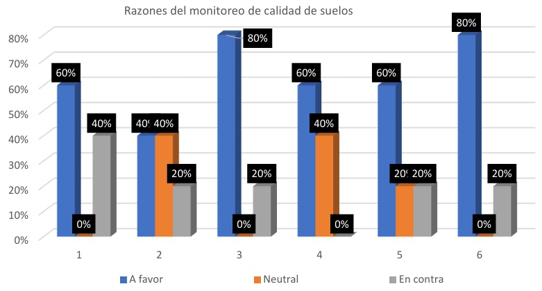 Buscando analogías dentro de la percepción de los especialistas o encargados de laboratorios de suelo se planteó una dimensión que diera respuesta al porqué de la práctica agrícola de monitoreo de calidad de los mismos, es decir, 1) ¿quiénes? y 2) ¿por qué se ocupan en llevar a cabo tal actividad de vigilancia?; los resultados indican lo siguiente: Como se puede observar, los razonamientos 1 y 2 contemplados en esta dimensión se asocian a dar respuesta a las interrogantes antes plasmadas, los encuestados subrayan en un 60% que quienes vigilan la calidad del suelo de sus predios agrícolas son los pequeños agricultores, el otro 40% marcó lo contrario.