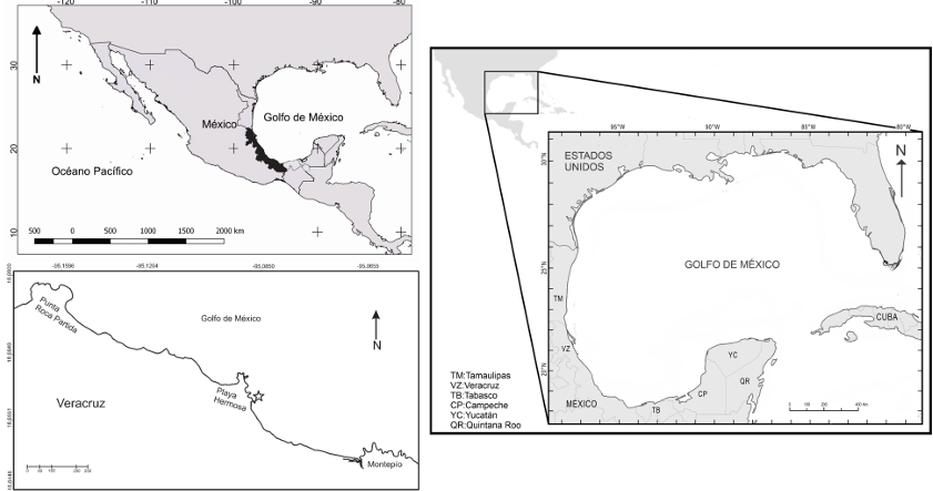 El sitio de recolección de los moluscos se ubica en las coordenadas geográficas 18°39'51''N y 95°7'48''O, en la localidad Playa Hermosa, Veracruz, México (Fig. 1). La playa se caracteriza por presentar una pendiente pronunciada y un derrame de lava solidificada (macizo expuesto) paralelo a la línea de costa, donde se forman pozas intermareales (García-López et al., 2017). En relación con el régimen de vientos y lluvias, presenta una estacionalidad climática que se caracteriza por tres periodos diferentes: secas, de febrero a mayo; lluvias, de junio a octubre, y frentes fríos anticiclónicos (nortes) de octubre a febrero, los cuales pueden sobreponerse relativamente (Day et al., 2005). Las mareas son diurnas con una amplitud media de 0.26 m (Sanvicente-Añorve et al., 2018).