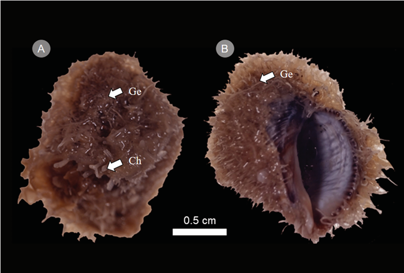 Figura 2: Stramonita rustica (Lamarck, 1822) cubiertas por algas epizoicas. A. vista dorsal, Ge (Gelidium J.V. Lamouroux), Ch (Chondria C. Agardh); B. vista ventral, Ge (Gelidium).