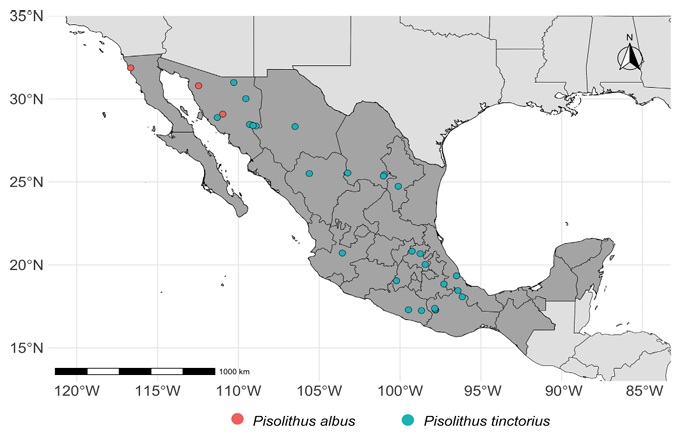 We confirm the presence of two species of Pisolithus widely distributed in Mexico. Pisolithus tinctorius is mainly associated with Pinus-Quercus trees and Carya illinoinensis trees. Until now, its presence has been molecularly confirmed in the states of Chihuahua, Coahuila, Durango, Guerrero, Hidalgo, Jalisco, the State of Mexico, Oaxaca, Sonora, and Veracruz, while P. albus is associated with Eucalyptus in semiarid zones of northwestern Mexico, in Sonora and Baja California. Among the specimens studied from Mexico and soil metabarcoding sequences, we had no evidence of any that could be identified with P. arhizus.