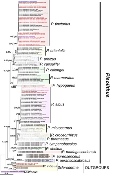 The result of Posterior Probability (PP) from Bayesian inference and bootstrap from maximum likelihood (BS) generated trees with similar topologies; the topology of the Bayesian analysis is shown (Fig. 2). The genus Pisolithus recovered as monophyletic (PP/BS=0.70/92). It presents three distinct lineages: the first comprises seven species (PP/BS=0.74/90): P. arhizus, P. capsulifer (Sowerby) Watling, Phosri & M.P. Martín, P. calongei M.P. Martín, Phosri & Watling, P. hypogaeus S.R. Thomas, Dell & Trappe, P. marmoratus (Berk.) E. Fisch, P. orientalis Watling, Phosri & M.P. Martín and P. tinctorius. Most sequences generated in this work grouped with P. tinctorius with high support (PP/BS=0.99/100) and are associated with Pinus spp., Quercus spp., and Carya illinoinensis. The second lineage includes five species (PP/BS=0.97/ 95): P. albus, P. croceorrhizus P. Leonard & McMull.-Fish., P. microcarpus (Cooke & Massee) G. Cunn., P. thermaeus T. Lebel, Pennycook & Beever, and P. tympanobaculus T. Lebel & M.D. Barrett. Three sequences generated in this study grouped with P. albus (PP/BS=0.99/95), a new record for Mexico. Two species form an unresolved polytomy: P. abditus Kanch., Sihan., Hogetsu & Watling, and P. madagascariensis Rivas-Ferreiro, Dentinger, Suz & A.M. Ainsw. The third lineage (PP/BS=0.99/94) is composed of P. aureosericeus M.P. Martín, Kaewgraj., Phosri & Watling, and P. aurantioscabrosus Watling. The P. indicus sequence was grouped within the Scleroderma genus (PP/BS=0.6/100).