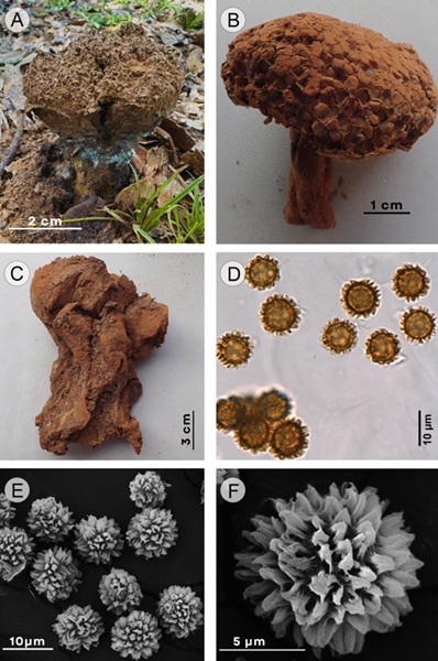 Figure 4: Pisolithus tinctorius (Mont.) E. Fisch. A. specimen in its habitat (MEXU 31650); B-C. herbarium specimens (MEXU 4569, MEXU 13790); D. basidiospores in light microscopy (MEXU17902); E-F. basidiospores in SEM (MEXU-31650).