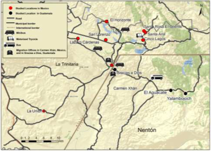 The border crossing in the Guatemalan village of Gracias a Dios, in the Nentón municipality of Guatemala, is across the border from the Mexican village of Carmen Xhan, in the Mexican municipality of La Trinitaria, is the most relevant for most of the Chuj people on both sides of the border. The Lagunas de Montebello National Park and the touristic city of Comitán, in Chiapas, have created mobility circuits in which cross-border families travel with business, leisure, family, and purchasing purposes. Map 1 shows one of the most popular routes used by cross-border families from Santa Rosa El Oriente and Yalambojoch.